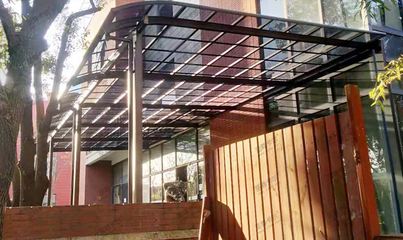 頂部用的是2.0mm聚碳酸酯板材,透光性能好(透光率88%)在陽光下曝曬不會產(chǎn)生黃變、霉化、透光不佳。表面有防紫外線的共擠層(uv涂成),可防止太陽紫外線引起的樹脂疲勞變黃。表面共擠層具有化學(xué)吸收紫外線并轉(zhuǎn)化為可見光。對植物光合作用有良好的穩(wěn)定效果,極適合保護汽車使其免受紫外線破壞。